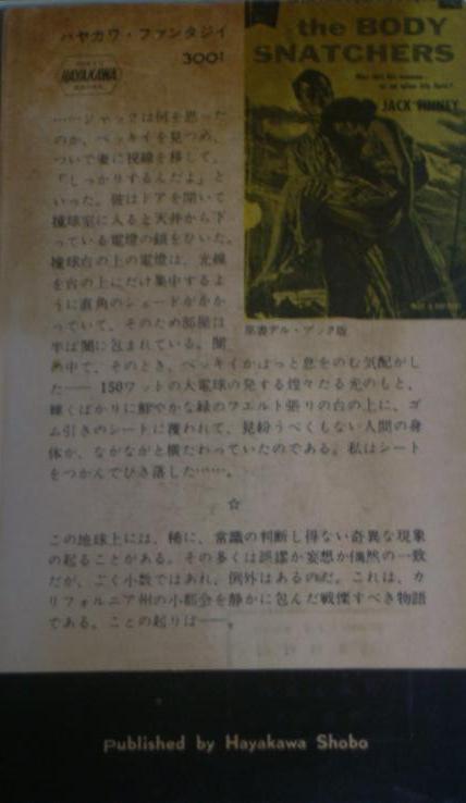 外見は以前とまったく変わらないのに、家族や恋人には別人になったように見える、そんな人間がある街で徐々に増えていく。その偽者は、豆のような宇宙生物のさやから生れてくる。偽者は「生まれ変わったようで気分爽快だ」と語り、主人公に「生まれ変わり」をすすめる……読んでいて、さやから生れた偽者はもとの人物とは別個の生き物なのだから「生まれ変わったよう」というのは何か欺かれているような気分になった。しかし豆のさやから新品の人間が出てくるというイメージは、映画で知っていてもやっぱり新鮮で面白かった。